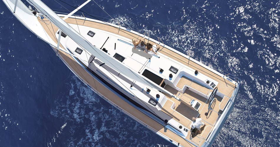 The foredeck and side decks provide generous room for a sailing yacht of this size. The innovative hull design also opens up new dimensions below deck.